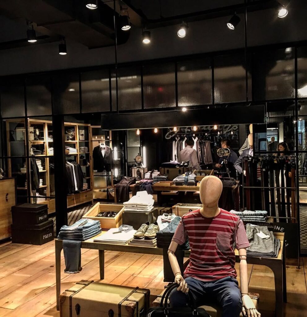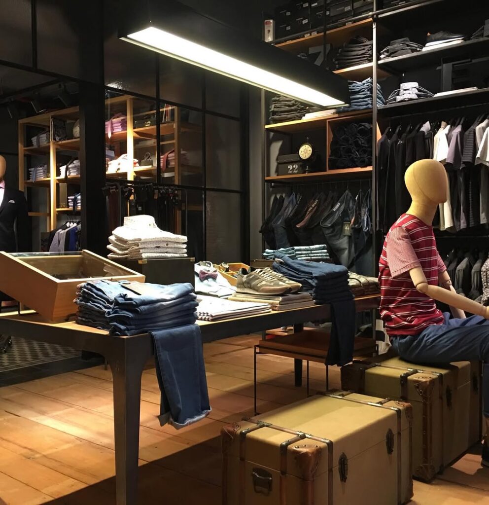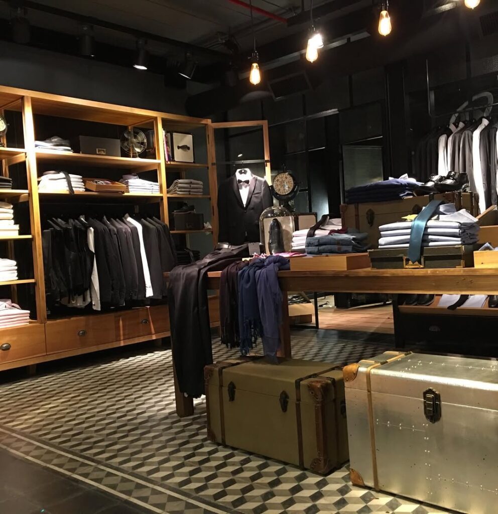 Un local que fusiona el estilo clásico masculino con una impronta contemporánea e industrial. El uso de madera, hierro negro, valijas vintage y luminarias cálidas generan una atmósfera elegante y sobria, que potencia la experiencia de compra a través de la ambientación cuidada y el detalle escenográfico.