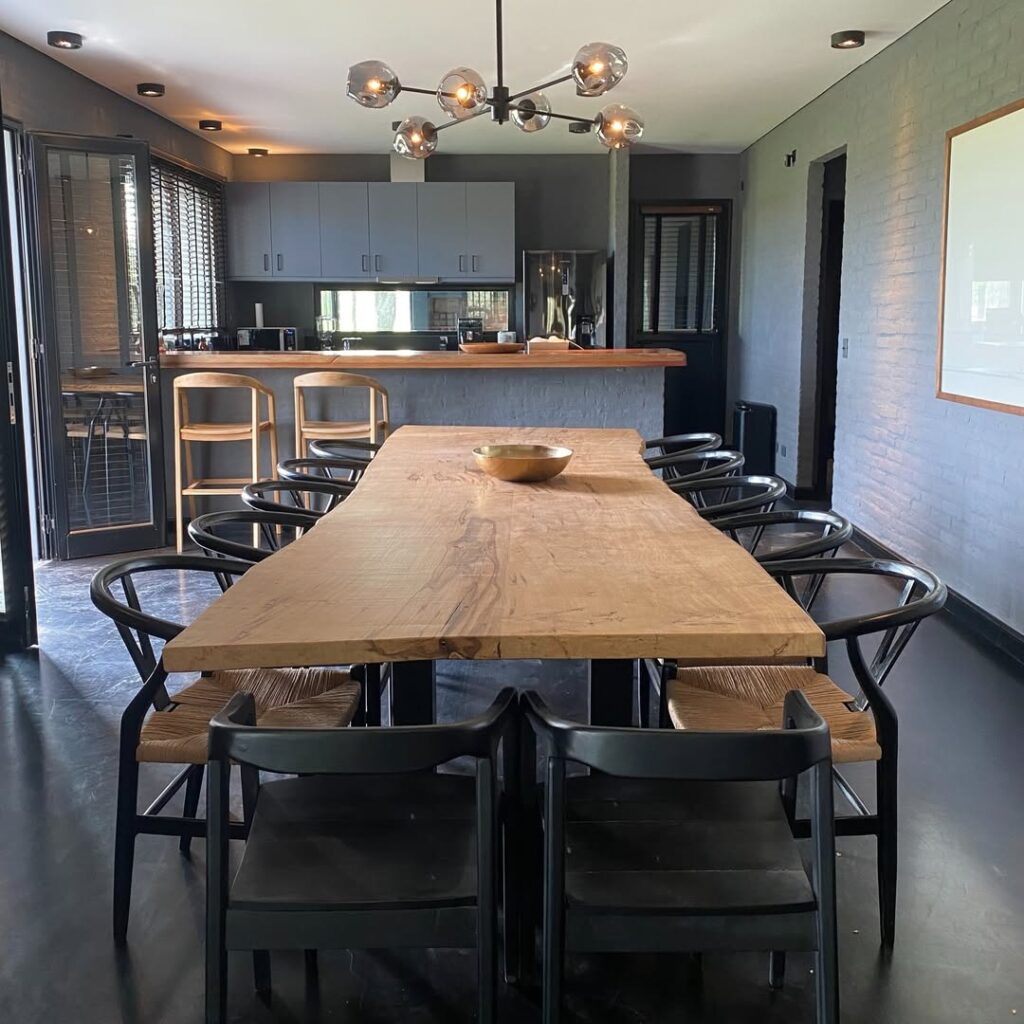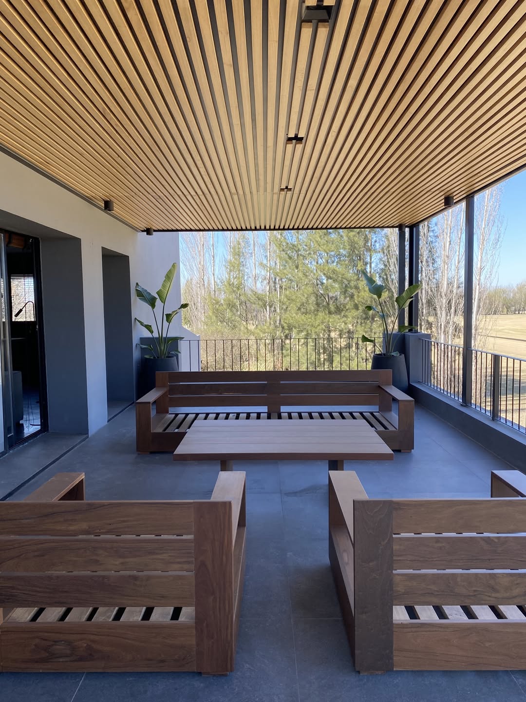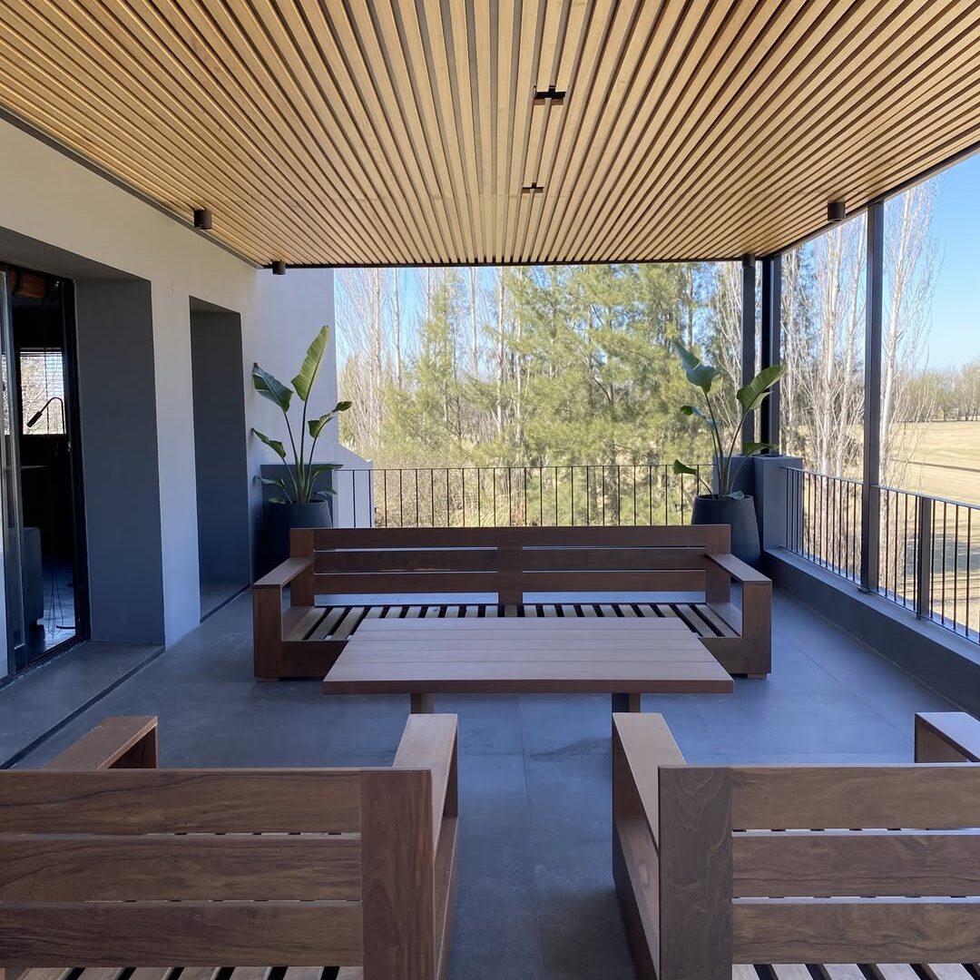 El equipamiento, de diseño sobrio y líneas contemporáneas, combina piezas artesanales con otras de carácter más estructurado, generando un equilibrio entre rusticidad y sofisticación. La luz natural y la vegetación del entorno se integran al interior mediante grandes ventanales, potenciando una experiencia envolvente y relajada, ideal para la contemplación, el descanso o un buen brindis post partido.