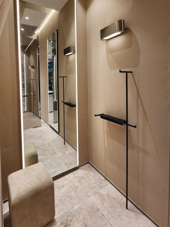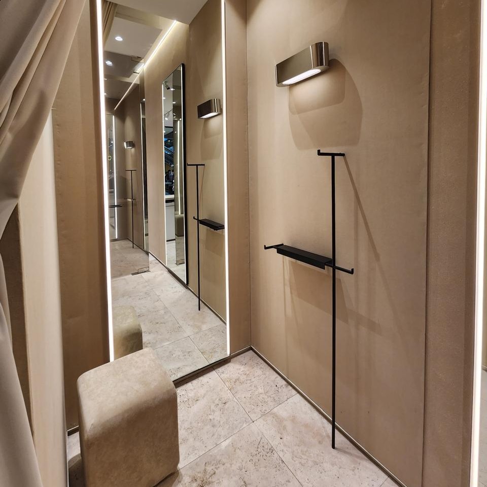 El local incorpora equipamiento hecho a medida, iluminación puntual para destacar los productos y exhibidores circulares que refuerzan la experiencia sensorial. El mobiliario curvo y tapizado, junto con los espejos enmarcados, aportan un toque de intimidad y confort. Esta intervención logra transmitir una identidad sólida y flexible, manteniéndose fiel al ADN de la marca y adaptándose a las nuevas exigencias del retail.