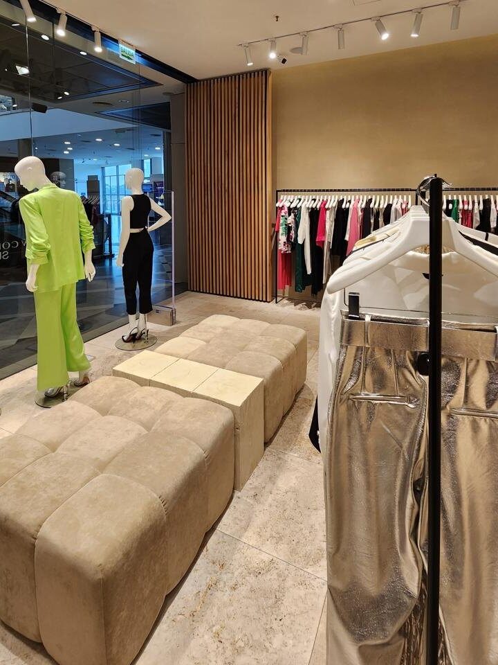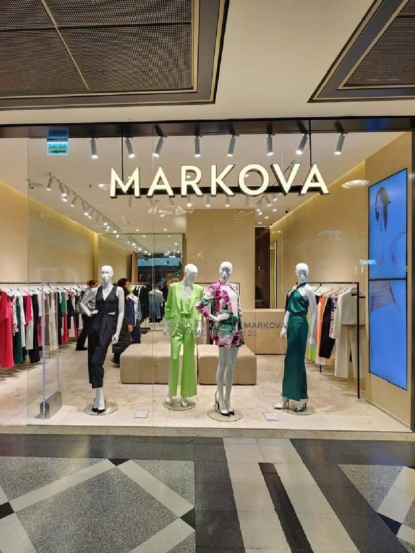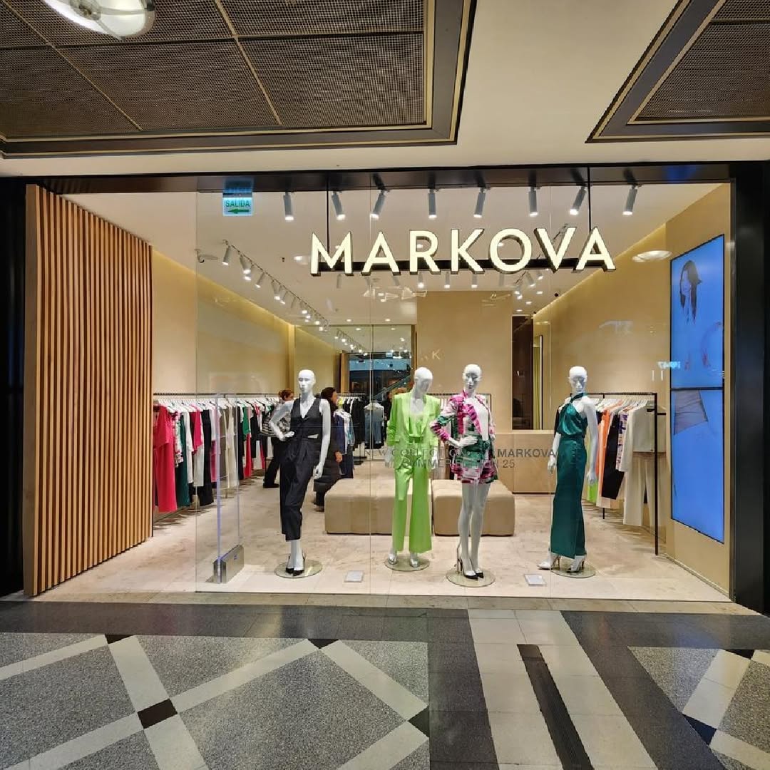 Para la nueva imagen de Markova en Paseo Alcorta, desarrollamos una propuesta que reinterpreta la elegancia de la marca con un enfoque contemporáneo. El diseño se articula en torno a una paleta neutra y cálida, donde el beige y los tonos arena se combinan con el negro y detalles en dorado para realzar la sofisticación del espacio. La celosía de madera vertical acompaña desde el acceso y se convierte en un recurso distintivo que acompaña el recorrido visual.