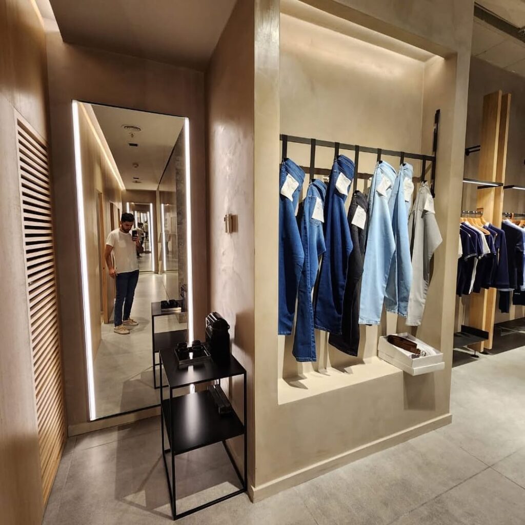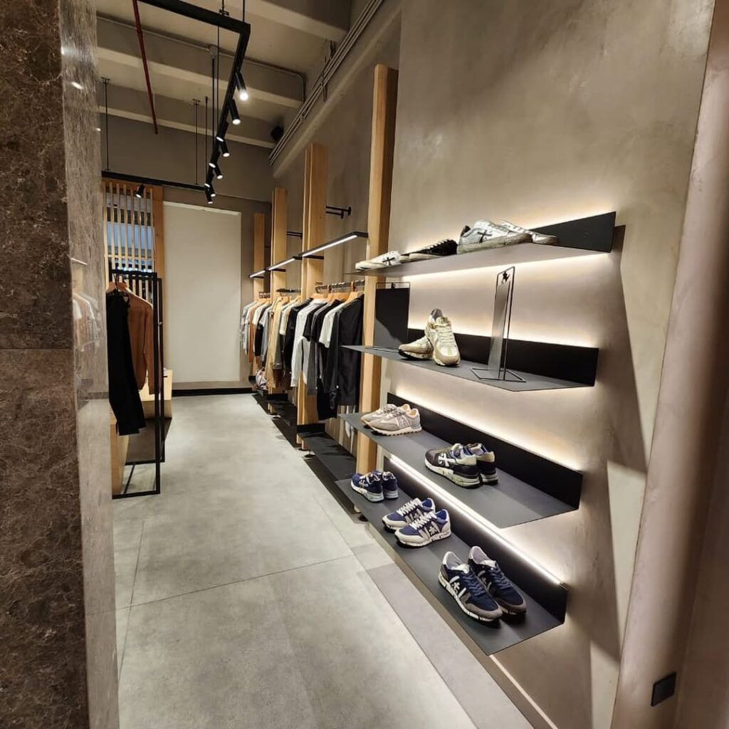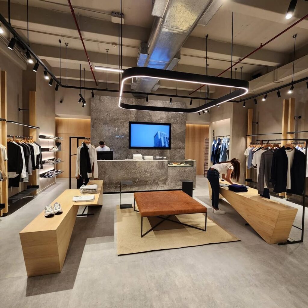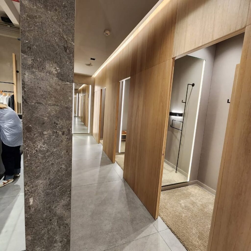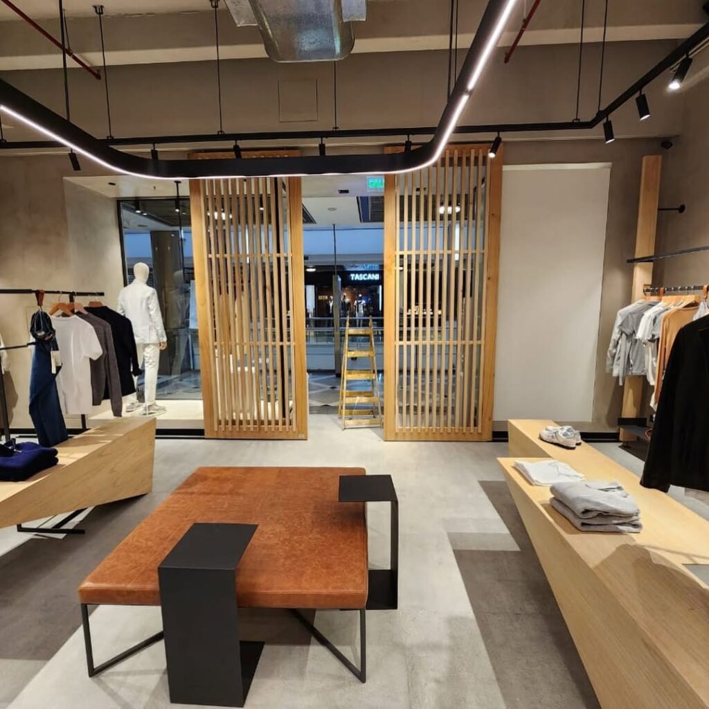 El local de Rise en Alcorta Shopping apuesta por un diseño minimalista con carácter, donde la nobleza de los materiales y una cuidada iluminación destacan el producto como protagonista. El uso de madera clara, piedra natural y una paleta neutra crean una atmósfera contemporánea, mientras que los probadores y estanterías exhiben una ejecución precisa y elegante que acompaña la identidad urbana de la marca.