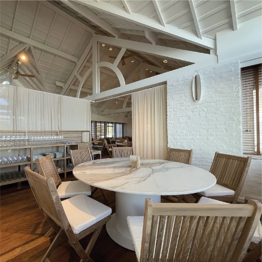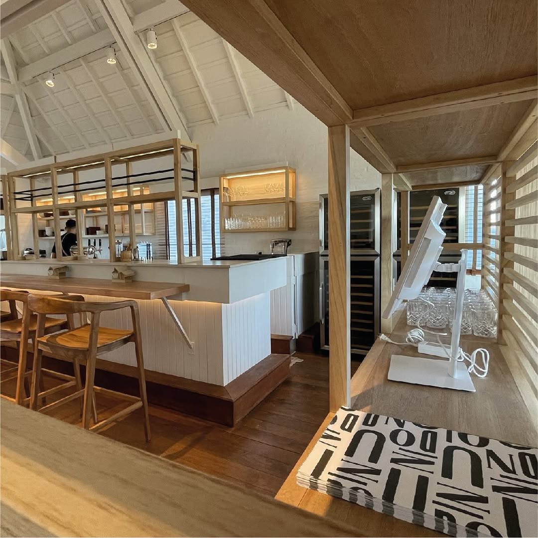 Diseñamos un espacio gastronómico que combina elegancia costera con calidez natural. Unido se articula entre la arquitectura de techos altos a la vista, maderas claras, textiles livianos y una atmósfera de serenidad que dialoga con el paisaje de la playa. La paleta neutra y la iluminación puntual acompañan una experiencia sensorial cuidada, mientras que la disposición del mobiliario favorece la circulación fluida entre mesas, barra y terrazas al aire libre con vista al mar.